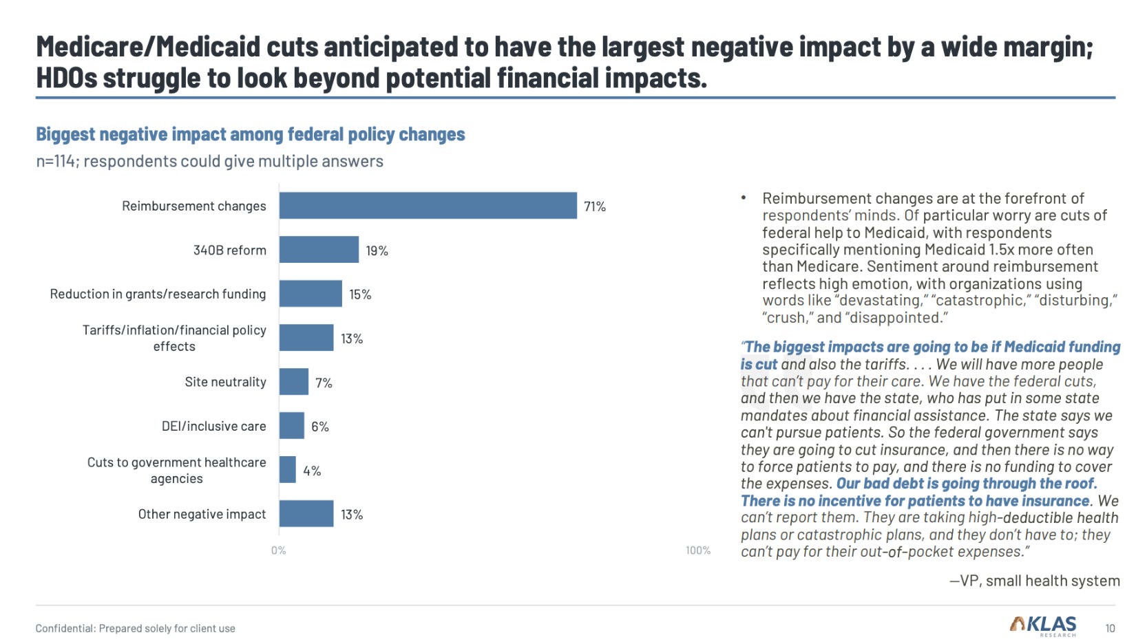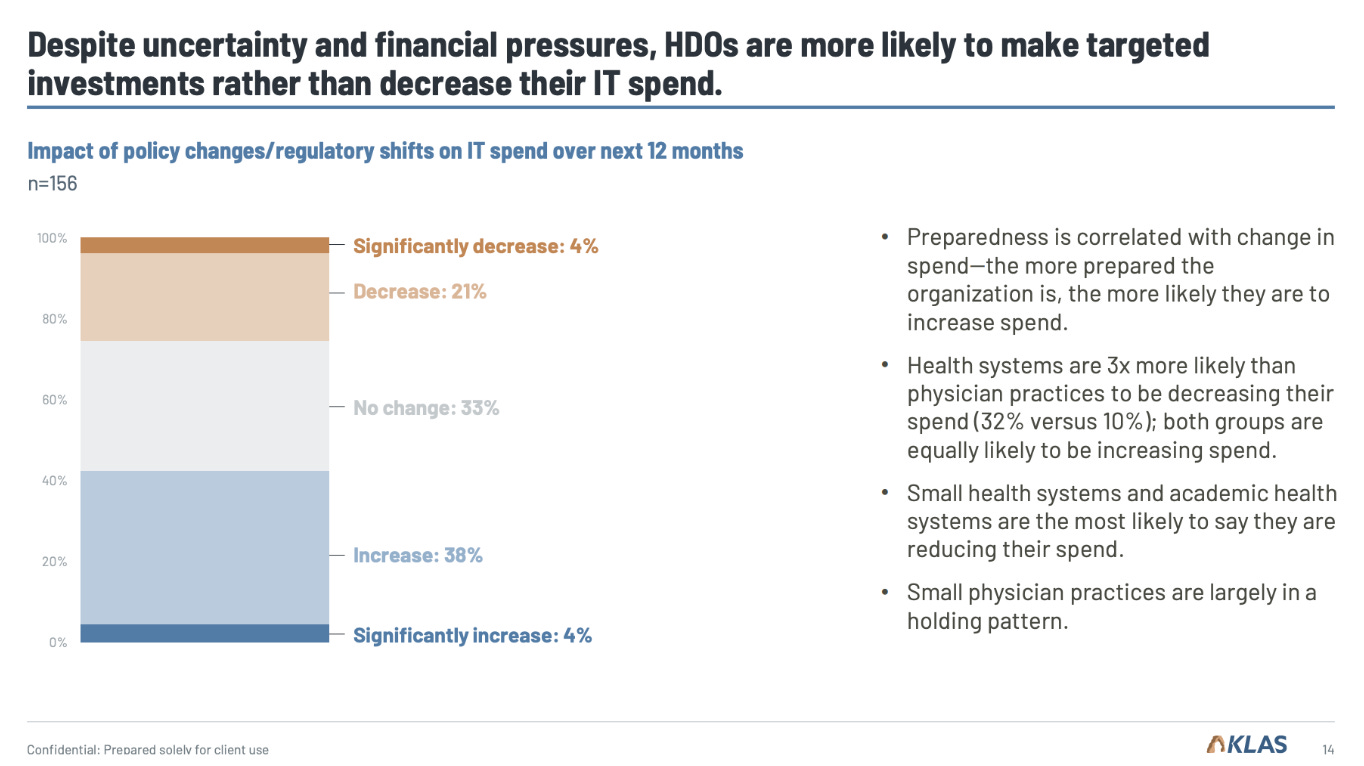 According to a recent research survey by KLAS, most healthcare executives see the changes to Medicaid and reimbursement changes as negative developments for their organizations. This is on top of the on again and off again tariffs that could also mean higher input costs and squeezed margins. A 2024 McKinsey paper indicates that the health system margins have decreased in the aftermath of the pandemic so the new policy developments can be extra problematic. “The biggest impacts are going to be if Medicaid funding is cut and also the tariffs . . . We will have more people [who] can’t pay for their care. We have the federal cuts, and then we have the state, who has put in some state mandates about financial assistance. The state says we can’t pursue patients. So the federal government says they are going to cut insurance, and then there is no way to force patients to pay, and there is no funding to cover the expenses,” a vice president with a small health system said in the survey report.